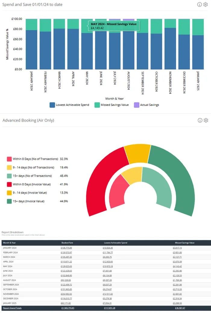 Our reporting suite puts all the important travel data right at your fingertips, whenever you need it and at no extra cost. It gives you clear, real-time insights into how your travel budget is being spent, where you’re saving money, and even where you might be missing out on savings. You can easily see who your top travelers are, spot booking trends, and get a full picture of your travel program’s performance. It’s designed to be simple and intuitive, so you can make smarter decisions, keep travel costs under control, and keep your team moving safe and efficiently.
